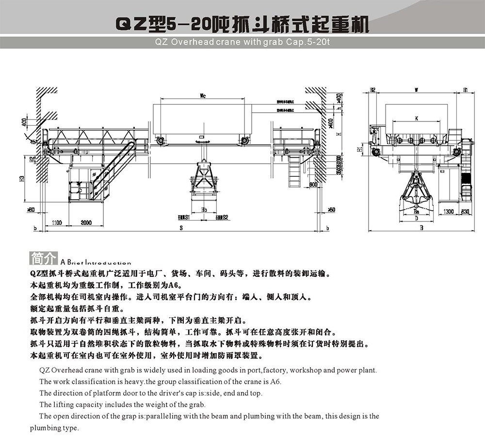 QZ型抓斗橋式起重機其設計制造符合GB、FEM、IEC等 和 通用標準。其結構有單層車架雙層車架,單卷筒和雙卷筒組;稱量綜合精度≤±1%;具有手動控制、半自動控制和全自動控制三種控制模式、三種控制模式可自由切換,在任何一種自動模式下都具有手動優先功能。