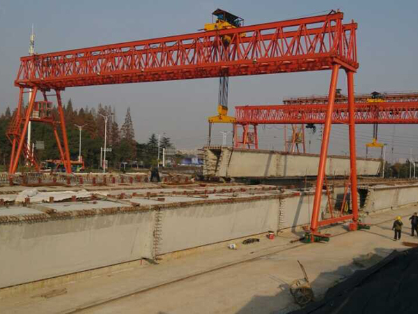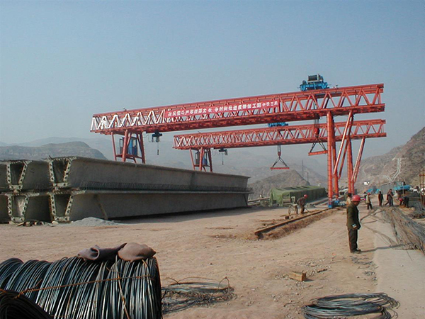 該設備既可兩臺配合抬吊預制梁,也可以單臺起重機配雙吊具起吊預制梁,兩臺同時起重的提梁機各自的起重量一般為450噸,單臺起重的提梁機起重量通常可達900噸。它配置支腿行走、天車行走及天車起吊設備,可以實現全方位機械化動作。主要用于將預制梁從制梁臺提吊至存梁臺位,預制梁養護完成后將其從存梁臺位吊運到運梁車上。作為起重設備完成架橋機的組裝和拆卸。還用于架設墩身不高的旱橋。