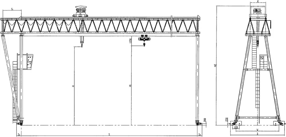 路橋門式起重機的主梁設計多采用三角桁架結構,上弦用工鋼加焊芯板,下弦用槽鋼加焊芯板,腹桿采用雙槽鋼對扣。主梁分節,接頭用銷軸連接。支腿采用鋼管腿結構,鋼管之間用穩定桿連接成三角穩定結構。本起重機由橋架、大車運行機構、小車、電氣設備等組成。全部機構均在司機室內操縱。